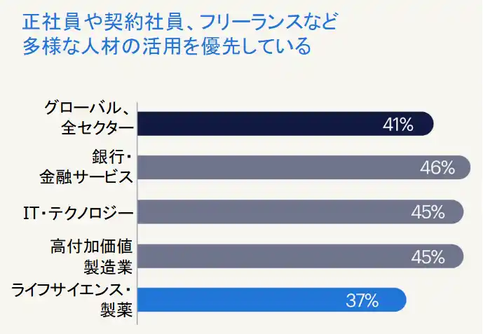 ライフサイエンス・製薬業界のリーダーの73%が今年、労働力のアジリティへの注力を強めていると回答しているものの、この数値は世界平均の87%を14ポイント下回っています。また、「正社員や派遣社員、フリーランスなど多様な人材の活用を優先している」と答えた企業はわずか37%に留まり、主要業界の中で最も低い数値となりました。このことは、固定的な役割からスキルベースの考え方へと転換する機会を示唆しています。本レポートは、仕事をモジュール式のタスクに分解する「ピクセル化」を進め、固定的な役割構造を打破し、ハイブリッド、プロジェクトベース、フリーランスなどの柔軟なモデルを統合していくことが必要と指摘しています。 |