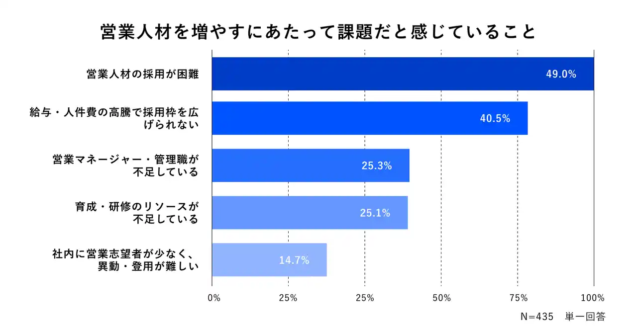 続いて、回答者733名のうち営業人員の増員について課題を感じている435名にその内容を尋ねたところ、最も多かったのは「採用が困難」(49.0%)、次いで「給与・人件費の高騰で採用枠を広げられない」(40.5%)でした。人材不足の背景には、採用市場における人材獲得競争の激化や、コスト上昇の影響があることがうかがえます。 |