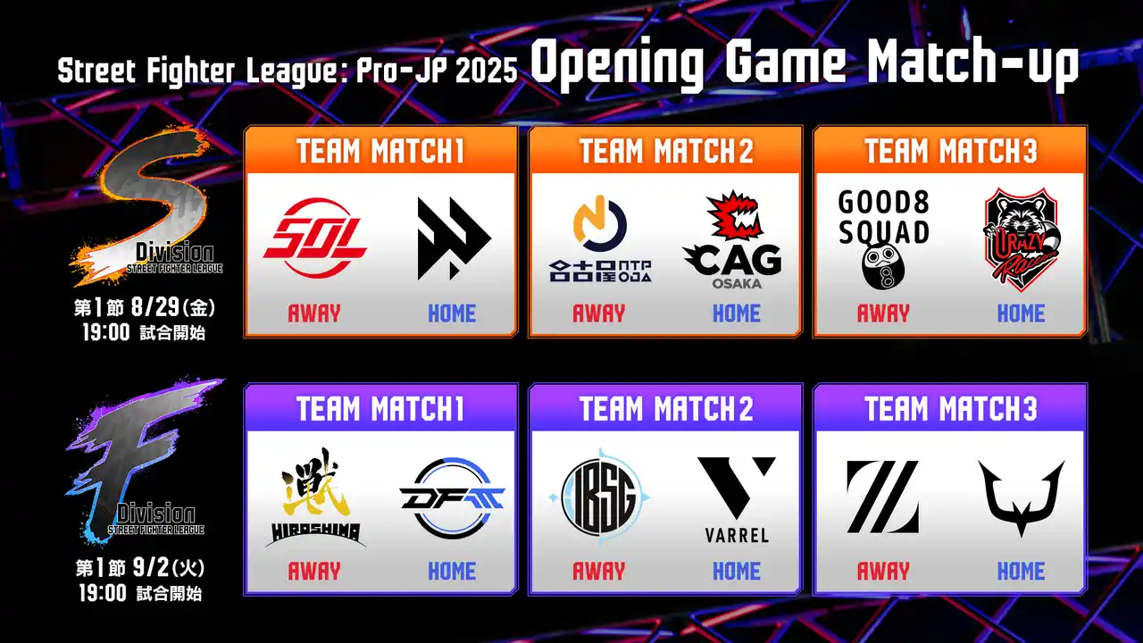 | 開幕戦以降の日程および本大会に関する最新情報は、『ストリートファイターリーグ: Pro-JP』公式HP(https://sf.esports.capcom.com/sfl/)およびCAPCOM eSports公式X(https://X.com/CAPCOM_eSports/)をご確認ください。 | ||||||||||||