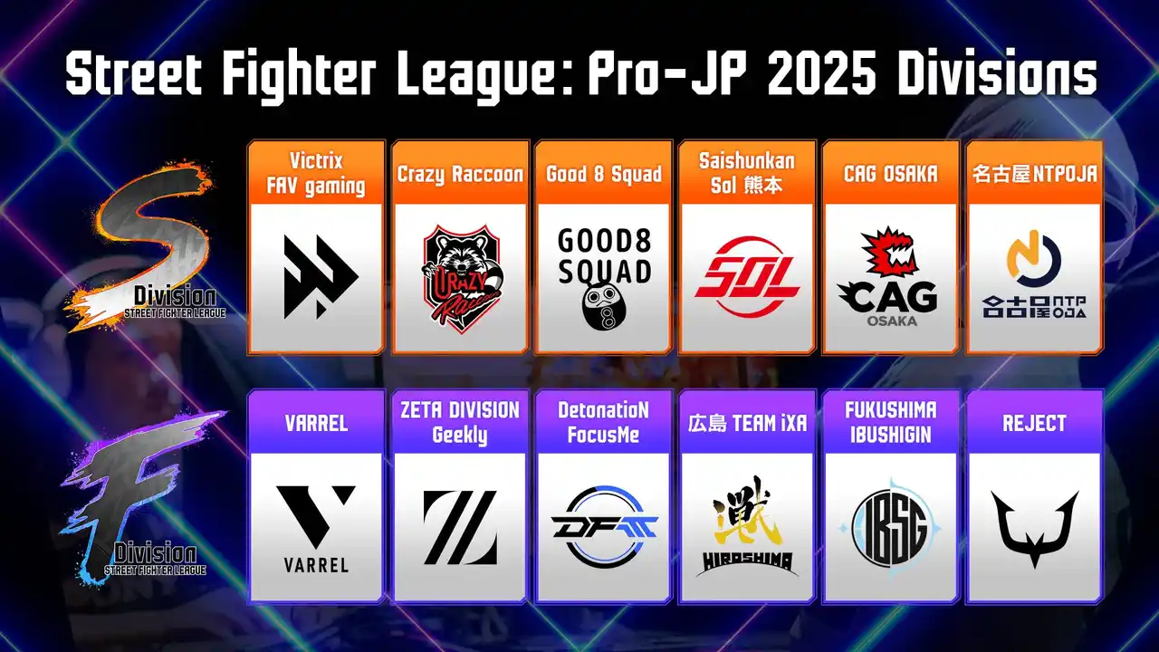 | 2018年の初開催から8シーズン目を迎える、日本最高峰のカプコン公式チームリーグ戦『ストリートファイターリーグ: Pro-JP 2025』。今シーズンも最新作「ストリートファイター6」を採用し、全12チームを6チームずつに分けた「2 Division(ディビジョン)制」で熱戦を繰り広げます。なお、開幕戦を含む全試合は、CAPCOM Fighters JP公式YouTubeとTwitchチャンネルで無料配信いたします。 | ||||||||||||