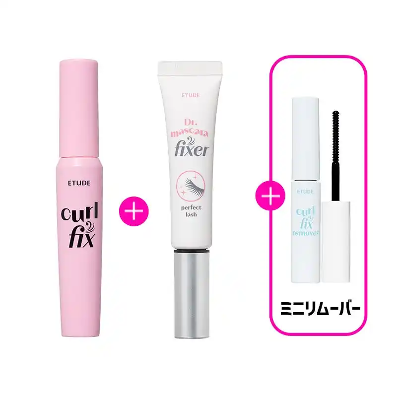 24時間* 上向きカールをキープする『カールフィックスマスカラ』と、マスカラのにじみを防ぎ、よりカール力を持続させ艶やかなまつ毛に仕上げる『マスカラフィクサー』、するんとオフする専用のミニリムーバーまでついたお得な美まつ毛カールキープセット。 |