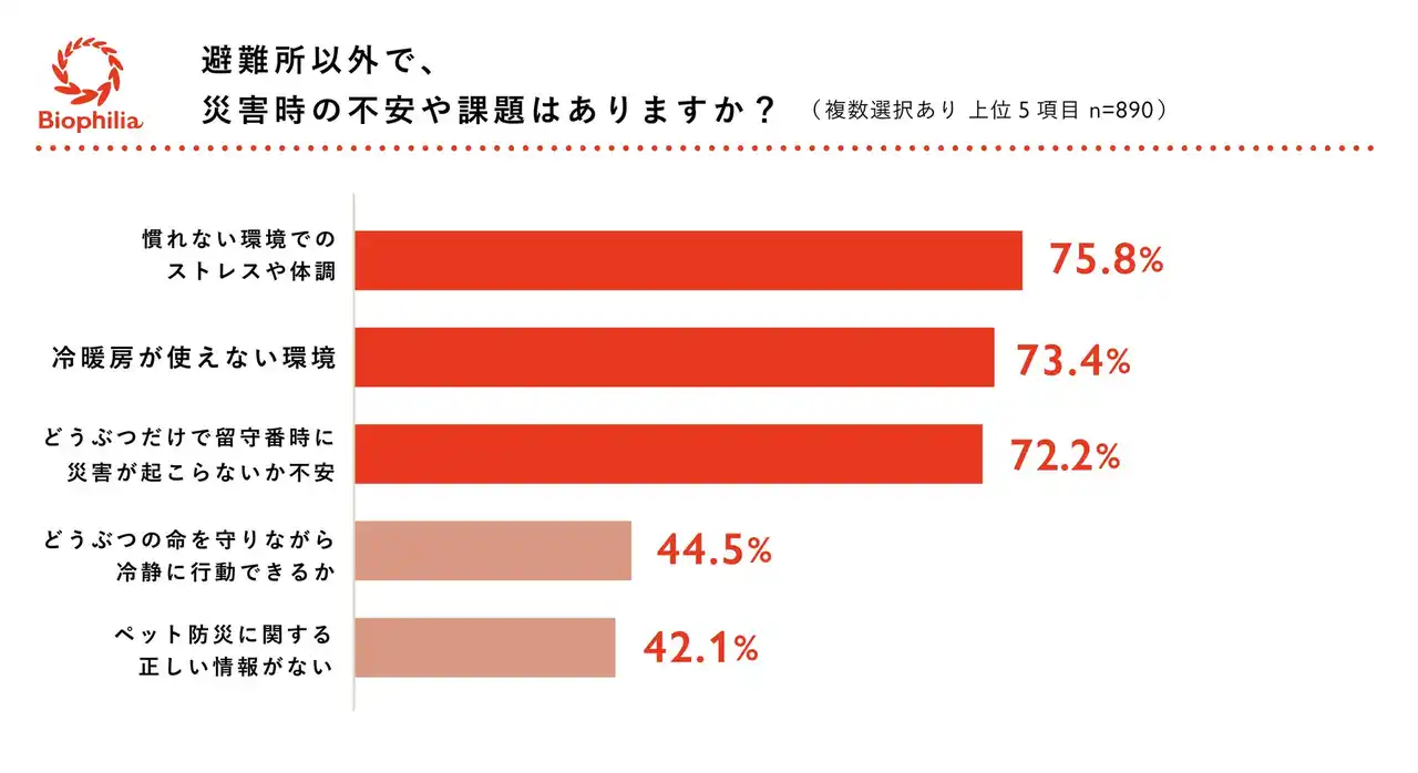 ・災害時の課題として多く挙がったのが、1位:環境変化によるストレスや体調、2位:冷房・暖房が使えない環境、3位:留守番させている時に災害が起こらないか不安、だった。 |
