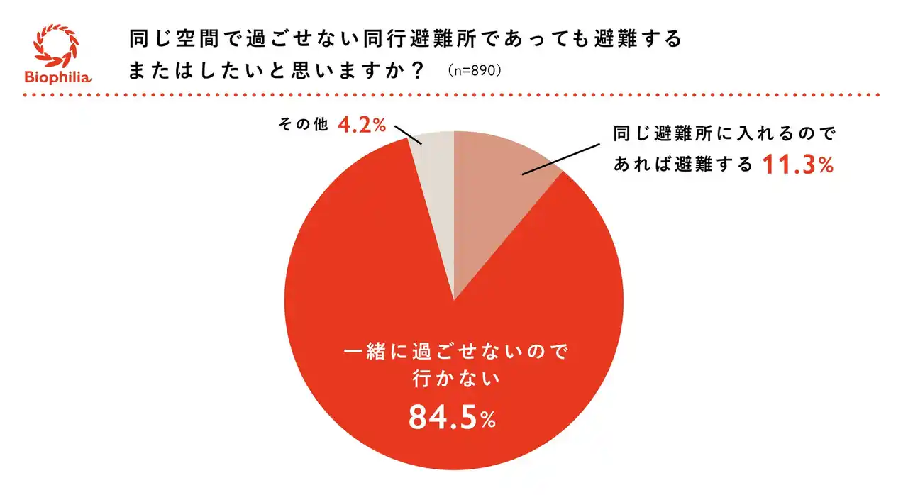 ・「ペットと同じ空間で過ごせない同行避難所は行かない」と回答した人は84.5%。 |