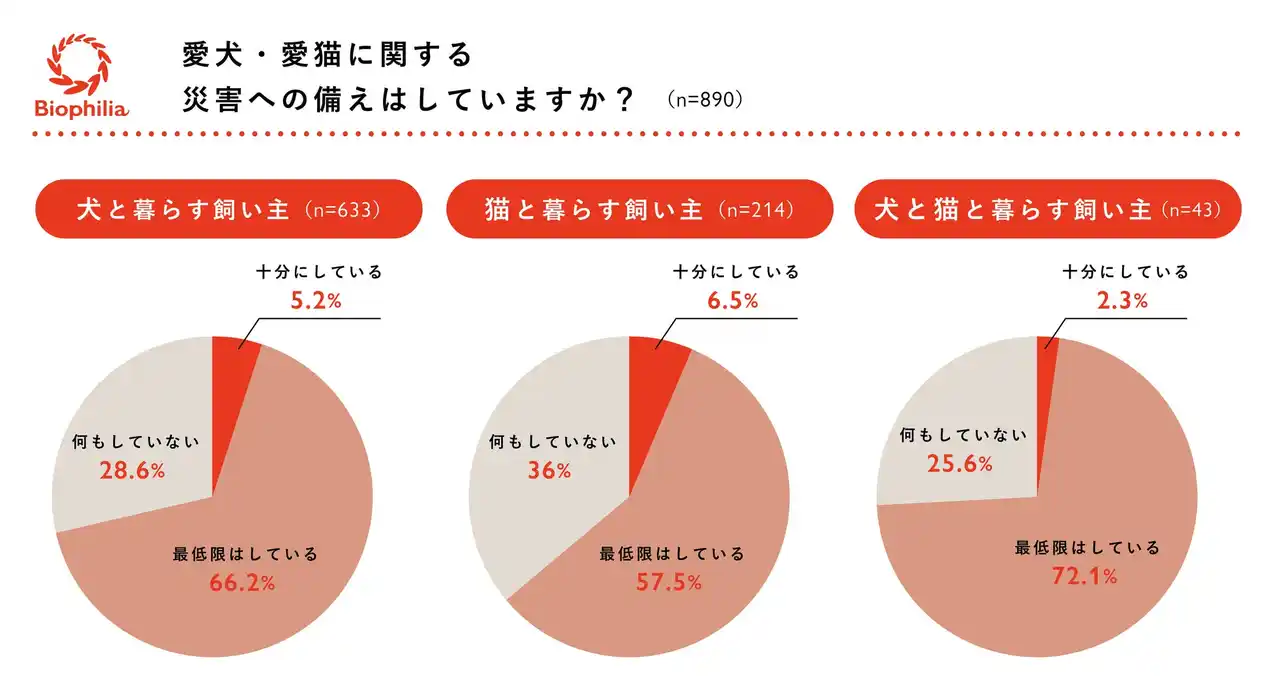 犬猫会員数35万頭(※1)の手作りごはんブランド「CoCo Gourmet(以下:ココグルメ)」「Miao Gourmet(以下:ミャオグルメ)」「にゃっち」を開発・販売する株式会社バイオフィリア(本社:東京都新宿区、代表:岩橋洸太)は、ペットの災害対策や国が推奨する同行避難に関する実態を調査するため、全国の犬や猫と暮らしている飼い主890名に、アンケート調査を実施しました。
