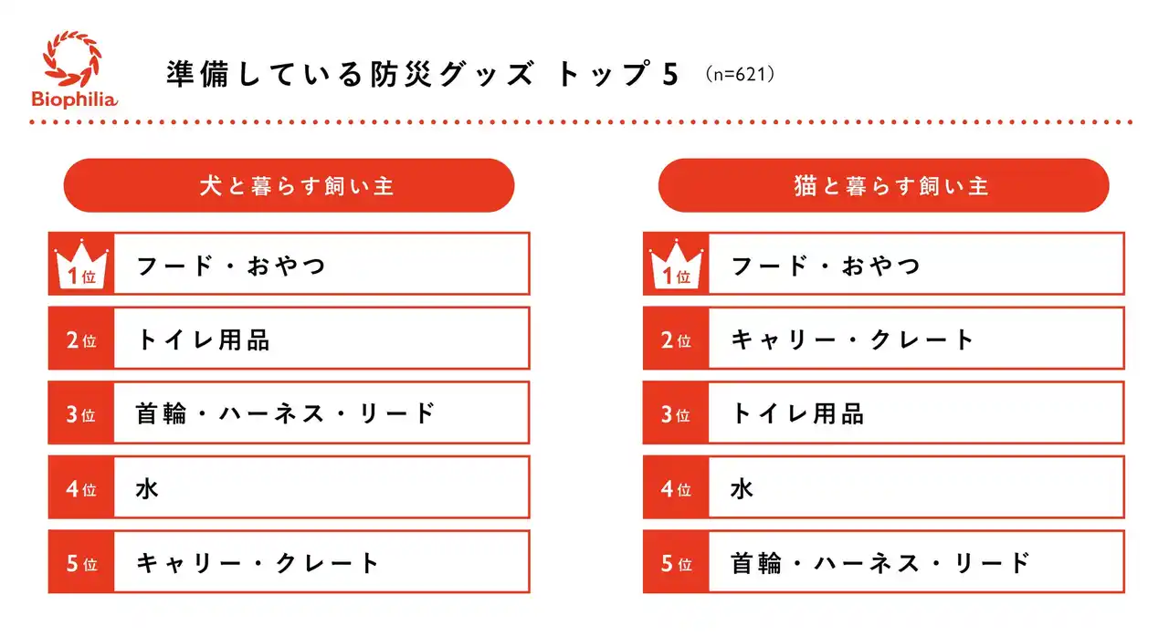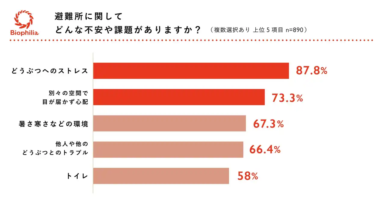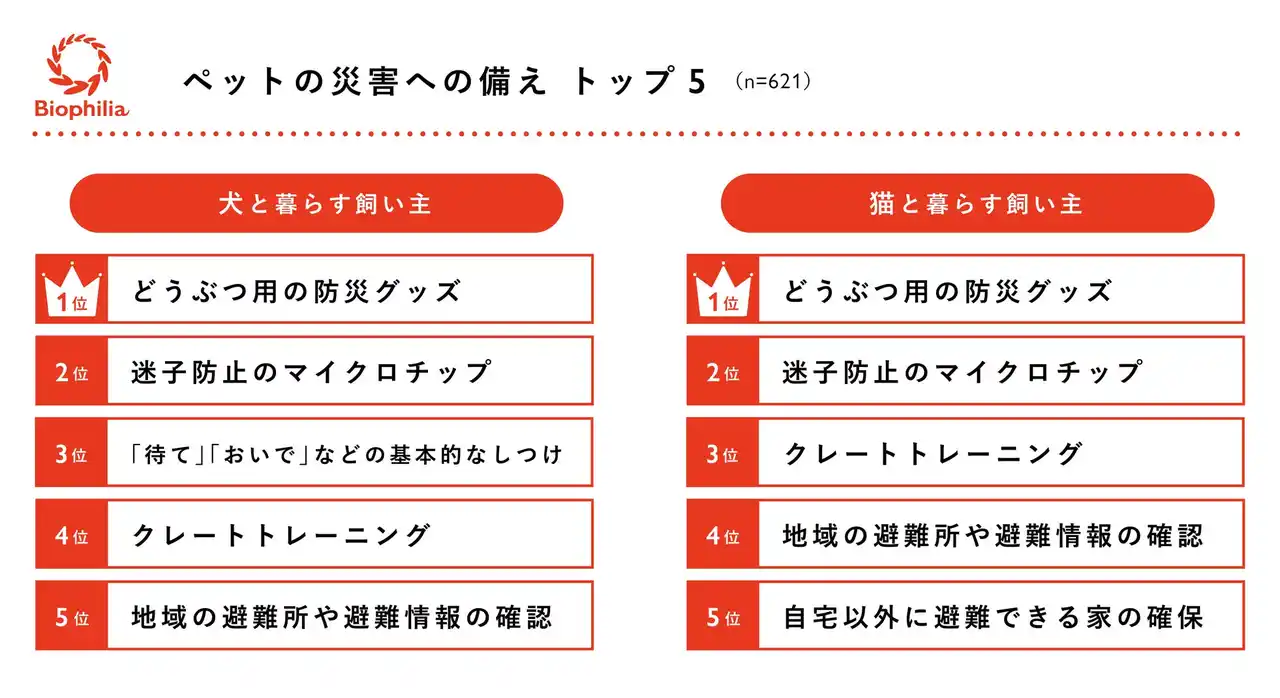 「すべてのどうぶつのいのちの尊厳が守られる新しい歴史をつくる」をミッションに、多くの会員さまとその大切なワンちゃん・ネコちゃんのいのちを守る企業として、防災に関する飼い主さまの現状や意向、同行避難に関する課題点を発信することで、少しでも人とペットの災害対策が前進することを目的とし、【バイオフィリア犬猫調査リリース#13】を発表しました。 |