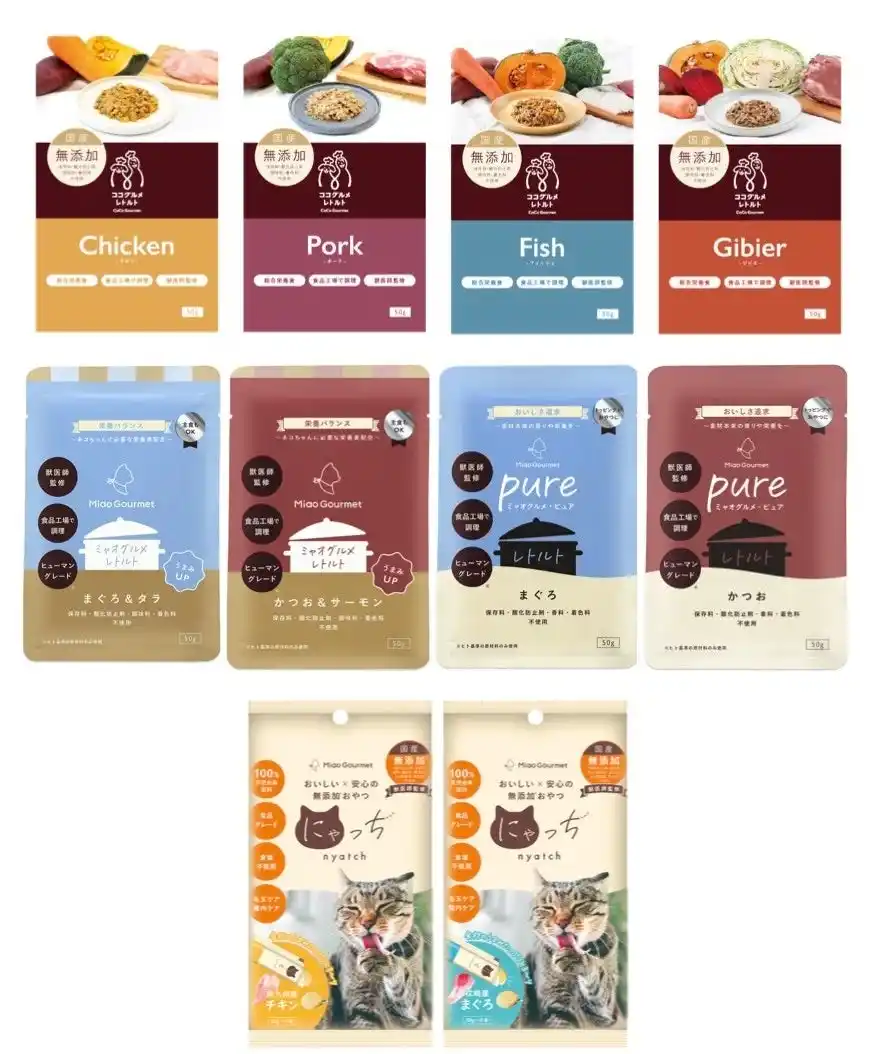 1日に必要な栄養がしっかり摂れる手作りごはん「ココグルメ」「ミャオグルメ」のレトルトタイプ、ストレス対策のおやつ「にゃっち」は防災用に最適 |