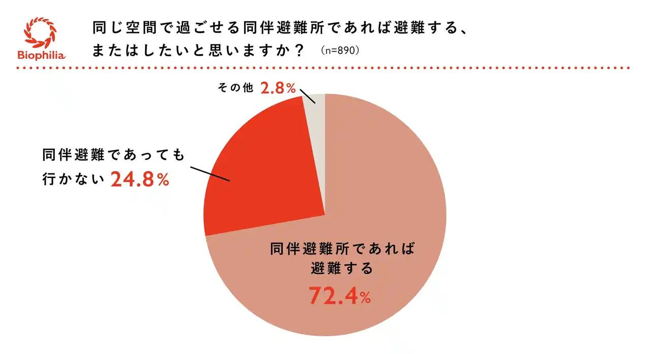 ・「同行避難所」に避難する人は11.3%だった一方で、同じ空間で過ごせる「同伴避難所」であれば避難する人は72.4%。 |