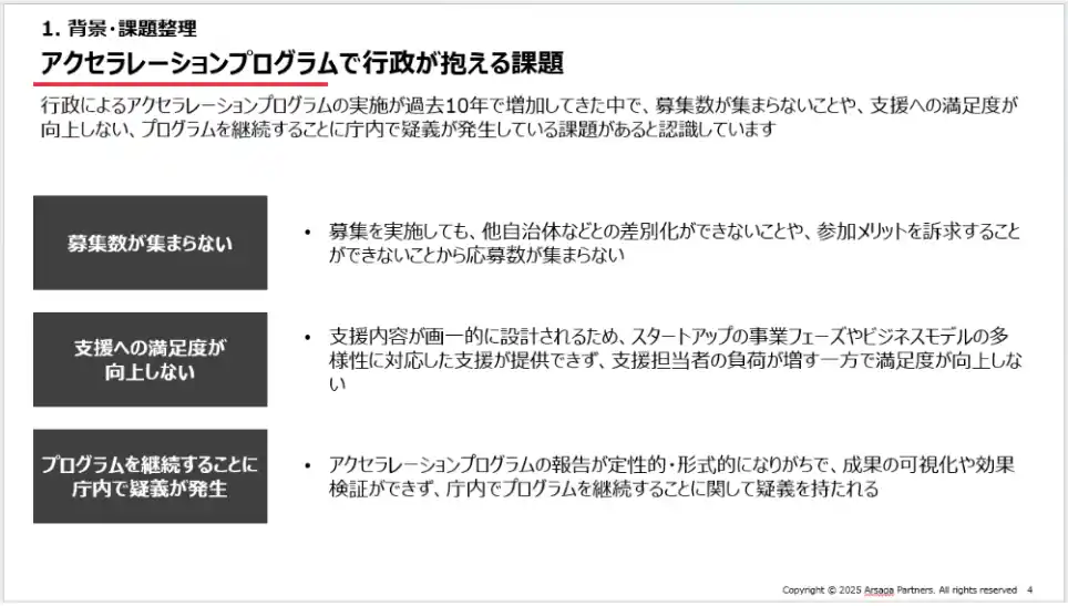 過去10年間で行政によるアクセラレーションプログラム(スタートアップの短期集中育成プログラム)の実施が増加する一方、募集数が集まらないことや、支援への満足度が向上しない、プログラムを継続することに庁内で疑義が発生している課題があると認識しています。 |