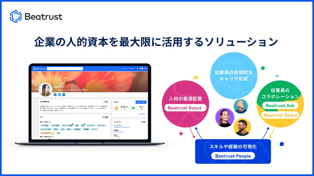 | Beatrustは、従業員一人ひとりのスキルや経験、趣味、嗜好といった多種多様な情報を可視化し、組織内の誰もが「この人、誰だろう?」「誰か、詳しい人はいないか?」を即座に発見・協業できるプラットフォームです。 | |||||||