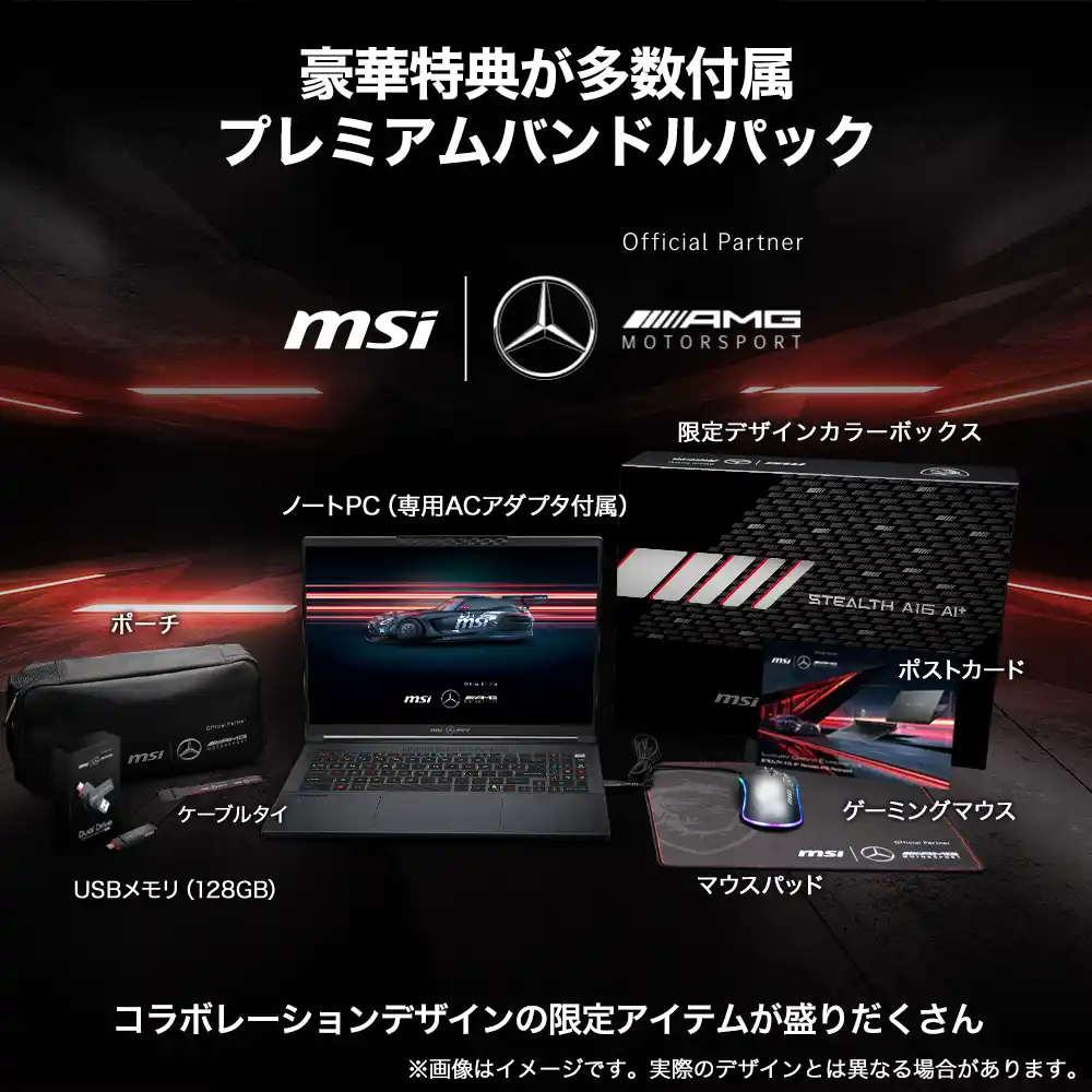 「Stealth A16 AI+ Mercedes-AMG Motorsport A3XW」は、最先端のパフォーマンスを追求するMSIの精神と、AMGドライビングパフォーマンスの魂が融合したプレミアムモデルです。 |