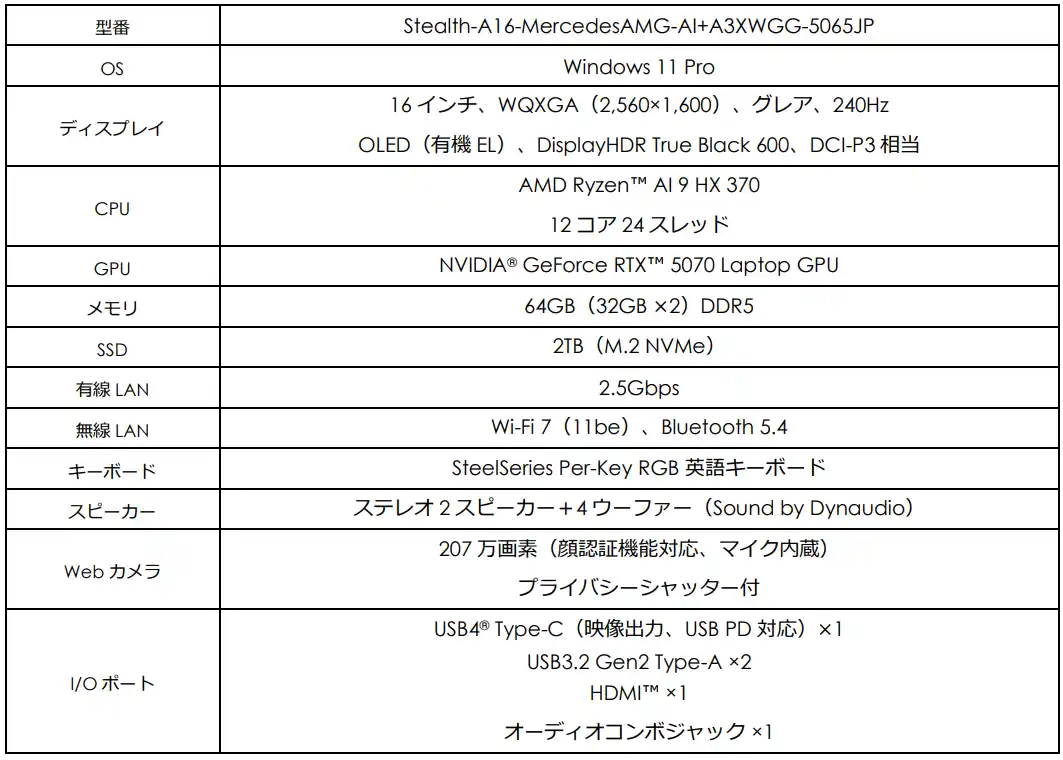 【Stealth A16 AI+ Mercedes-AMG Motorsport A3XWの主な特徴】 |