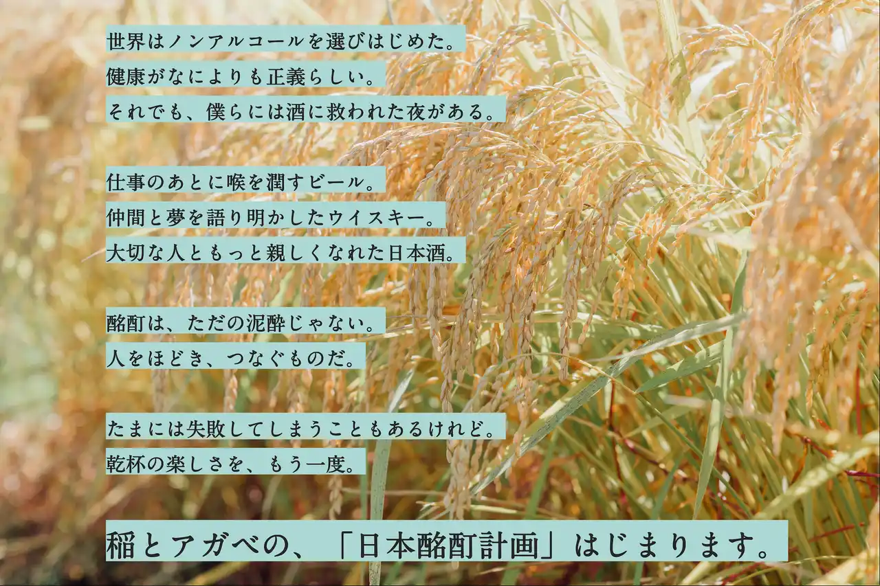 <『稲とアガベ 日本酩酊計画2025』について> 近年、若者を中心としたアルコール離れなどにより、日本酒の国内消費量は減少傾向にあります。これは単なる嗜好品の変化に留まらず、稲作や発酵といった、日本が古来より育んできた豊かな文化の継承が危ぶまれている状況とも言えます。 |