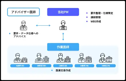 | プロジェクトの要件に応じて最適な専門人材をアサインし、実際の医療現場を想定した要件整理からデータ作成までを支援します。医師が参画・監修することで、臨床的な妥当性と実用性を兼ね備えた高品質データをゼロから構築できます。当社がデータ作成を推進し幅広い医師をアサインすることで、個別の病院や分野において発生しがちな作成データの偏りを均一にできるといったメリットが生まれます。 | ||||||||