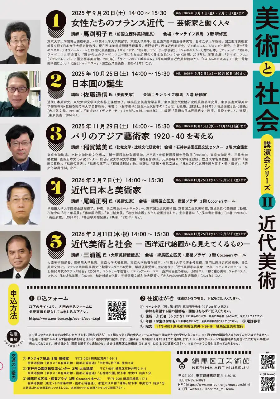 練馬区立美術館(東京都練馬区貫井)では、2025年9月から2026年2月にかけて、「美術と社会」講演会シリーズII:《近代美術》と題し全5回にわたって講演会を開催します。 |