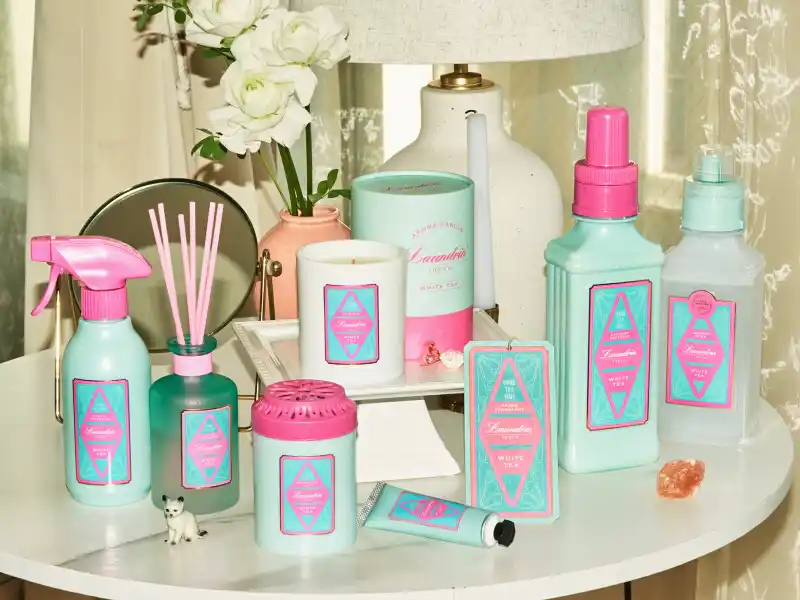 柔軟剤 本体 各 600mL 800 円・詰替 各 480mL 624 円 /ペーパーフレグランス 1 枚入り 382 円 / ファブリックミスト 各 300mL 591 円 ルームディフューザー各100mL 1,320 円 / フレグランスジェル 130g 877 円(全国発売中)/ 洗剤 410g 712 円(一部企業・EC サイトにて発売中) アロマキャンドル 各180g 2,970 円 /ハンドクリーム 各 30g 1,100 円(EC サイトにて発売中) |