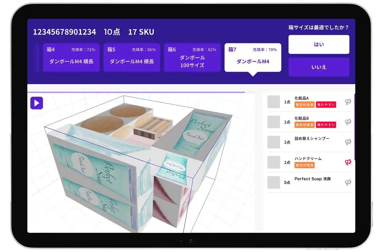 さらに、今年の4月販売以降早くも多くのお客様にご使用いただいている 「梱包アシストAI」もデモ展示致します。実際にシステム画面をご覧いただきながら弊社スタッフがご説明差し上げますので、梱包作業にご課題をお持ちのお客様はぜひお立ち寄りください。 |