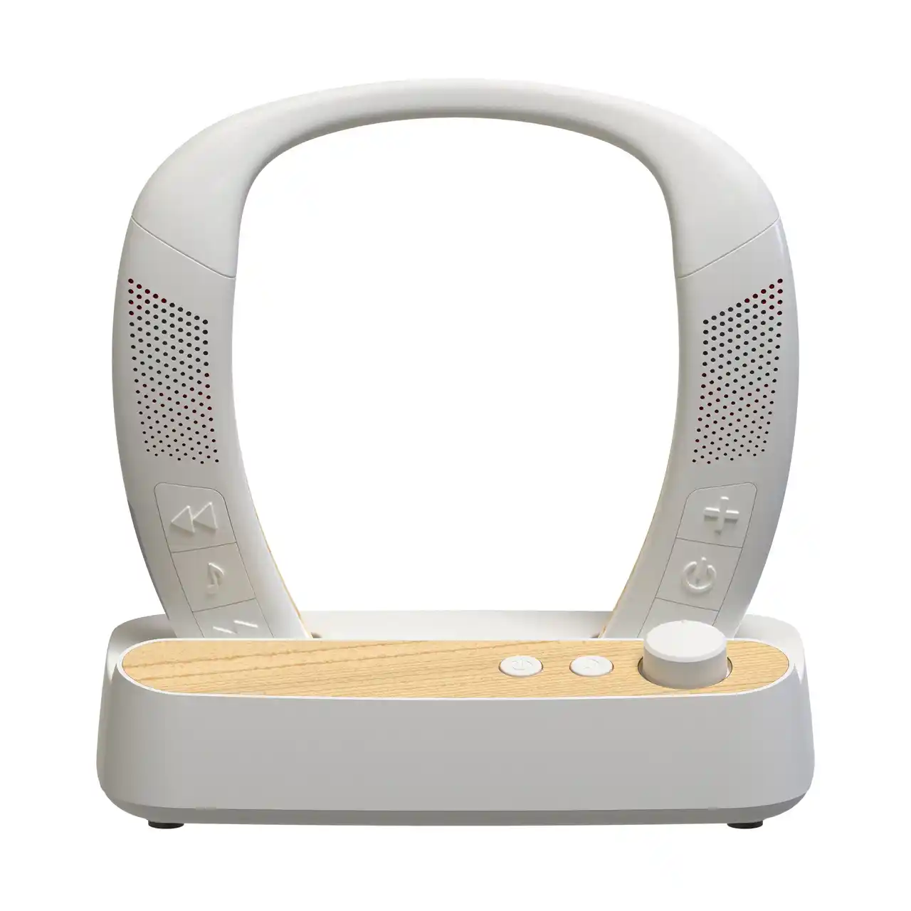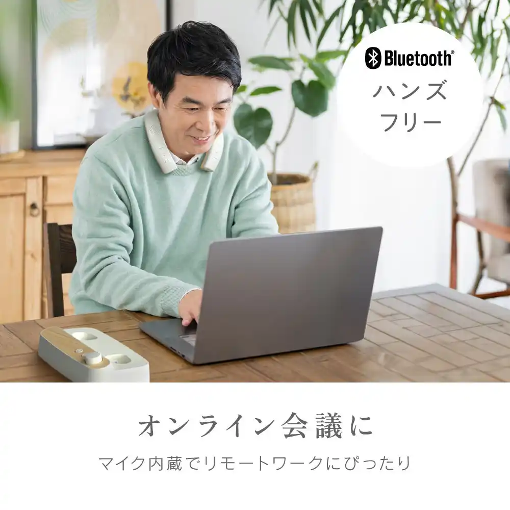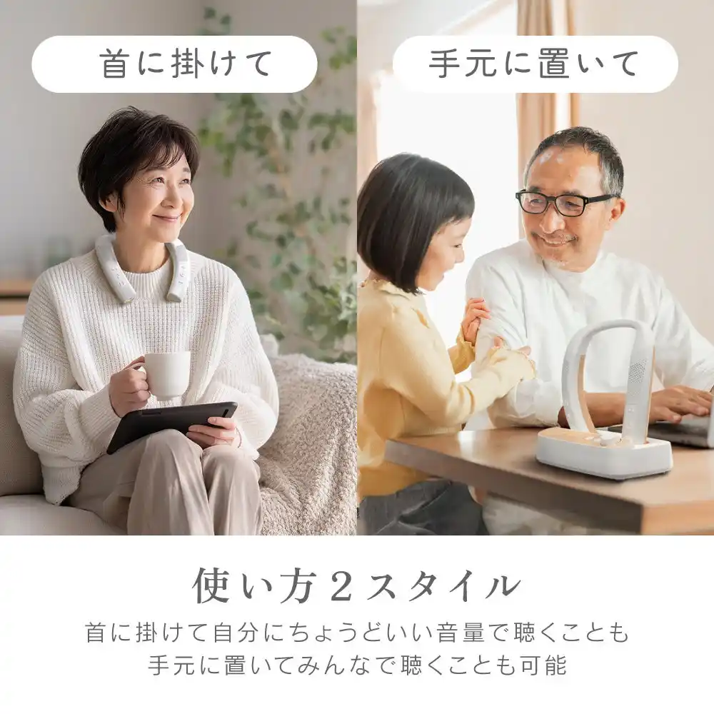 | 家事などの作業をしながら音楽やテレビ、動画を楽しみたいときなどには⾸に掛けて⾸掛けスピーカーとして、大きな音を出しづらい環境でテレビの音を自分の近くではっきりと聴きたいときなどは、机にスタンドごと置いて手元スピーカーとして、それぞれ活躍します。⽿をふさがないため長時間使用しても疲れにくく、周囲の音も自然に聞こえます。 | ||||||||||||||