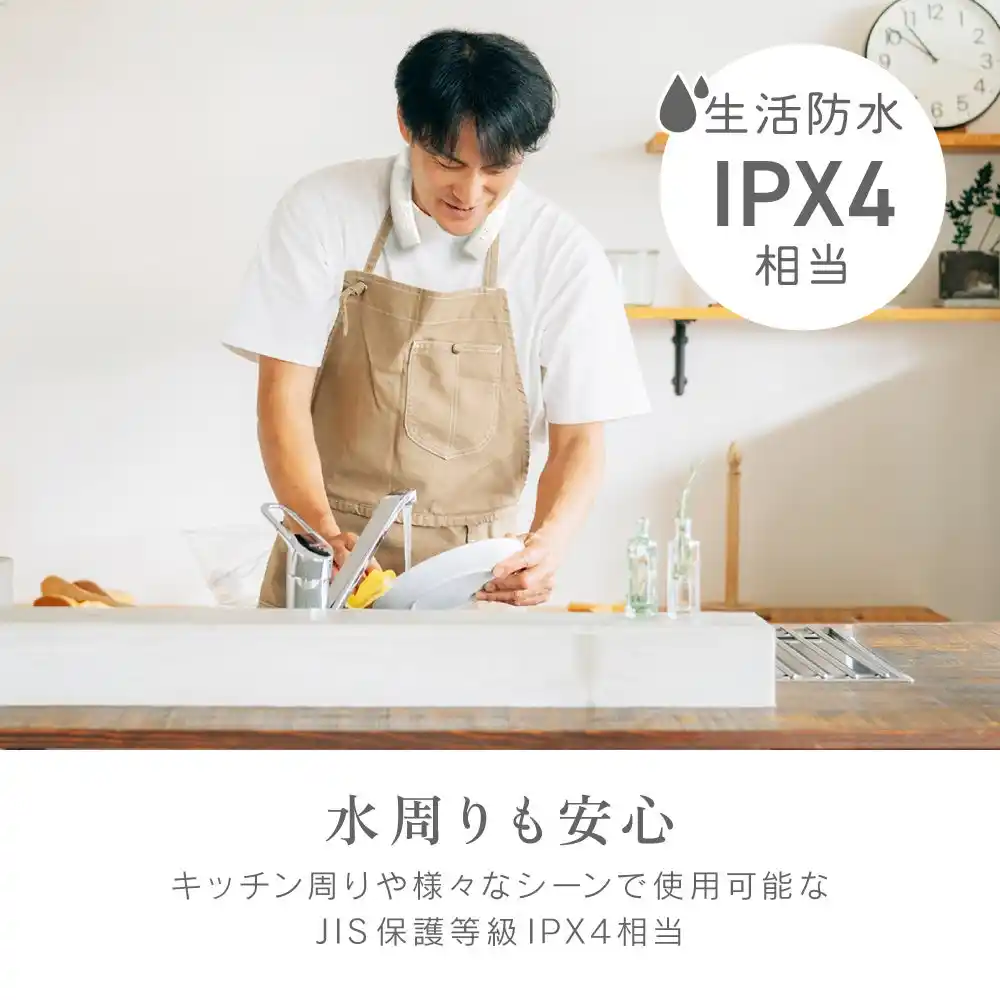 | 生活防水機能付きのため、キッチンや洗面所など水回りでの作業中にも 「ながら聴き*¹」が可能で、使用シーンが広がります。 | ||||||||||||||