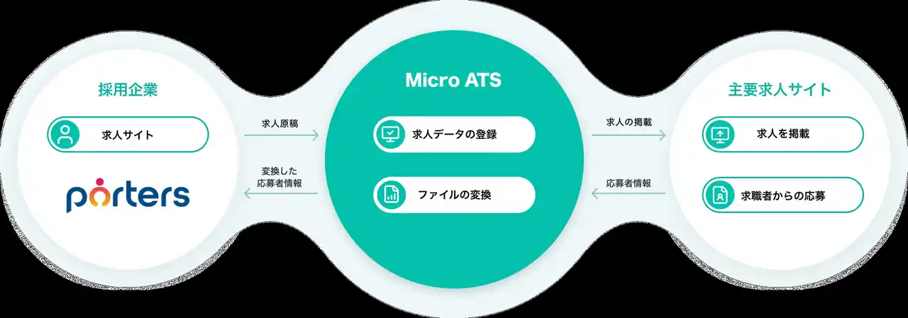 Micro ATSを利用することで、PORTERSユーザーは開発不要で主要求人サイトへの求人掲載から応募取得までを自動化できるようになります。 |