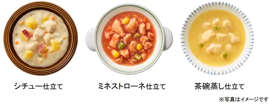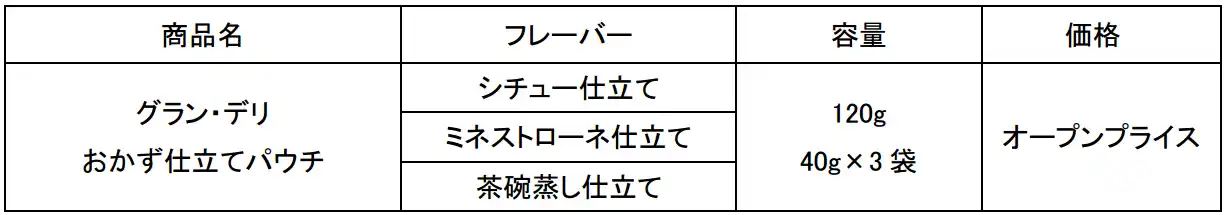 そこでこのたび、『グラン・デリ おかず仕立てパウチ』から「シチュー仕立て」「ミネストローネ仕立て」「茶碗蒸し仕立て」の3種類の新メニューを発売することとしました。 |