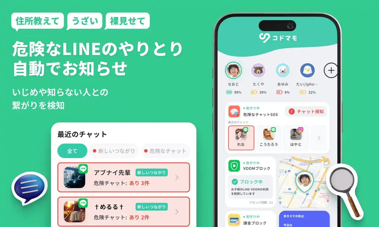 コドマモは、国内で唯一、LINEなどの危険チャットの検知(いじめ・誹謗中傷・自殺念慮・性犯罪をAIで検知し保護者へ通知)を子どものiPhoneおよびAndroidスマートフォンで行うことができるスマホアプリです。また、コドマモは危険チャットの検知だけでなく、子どもの現在地や移動履歴の確認や、歩きスマホの検知、スマホ利用時間の管理、性的な自撮りの検知など、様々な機能を提供しています。 |