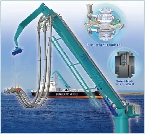 再生可能エネルギーの安全・迅速な海上荷役を実現する新技術:アンモニア用 高安全性 緊急離脱装置 船舶間アンモニア燃料供給用バンカリングブーム(右図) |