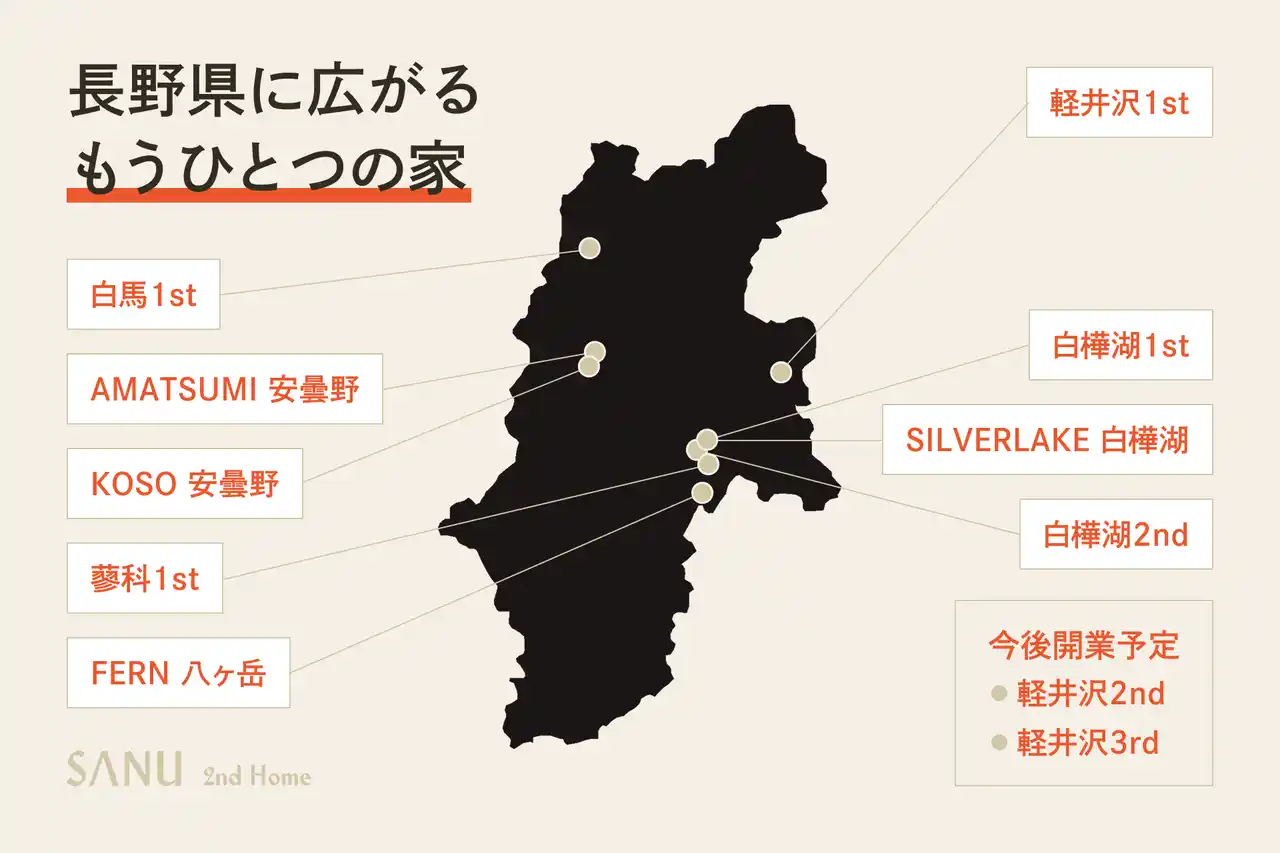 今回の開業により、長野県内のSANU 2nd Homeは8拠点36室に。白樺湖、白馬、蓼科、軽井沢など、高原や山岳エリアを中心に、遊休別荘や遊休地を活用しながら“自然と暮らす”拠点を広げてきました。 |