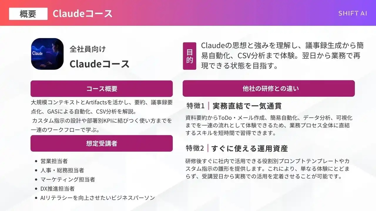 「日本をAI先進国に」を掲げ、AIのビジネス活用を学べる利用者数No.1※のAI学習プラットフォーム「SHIFT AI」を運営する株式会社SHIFT AI(東京都渋谷区、代表取締役 木内翔大、以下 当社)は、2025年8月28日、法人向け生成AI研修の新プログラム【Claudeコース】を提供開始します。 |