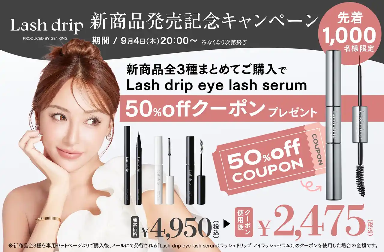 公式ECサイトにて新商品全3種(「Lash drip durable eyeliner(ラッシュドリップ デュラブルアイライナー)」「Lash drip separate long mascara(ラッシュドリップ セパレートロングマスカラ)」「Lash drip volume brush mascara(ラッシュドリップ ボリュームブラシマスカラ)」)をまとめて購入いただくと、次回「Lash drip eye lash serum(ラッシュドリップ アイラッシュセラム)」を50%OFFで購入できるクーポンを先着1,000名様にプレゼントいたします。 |