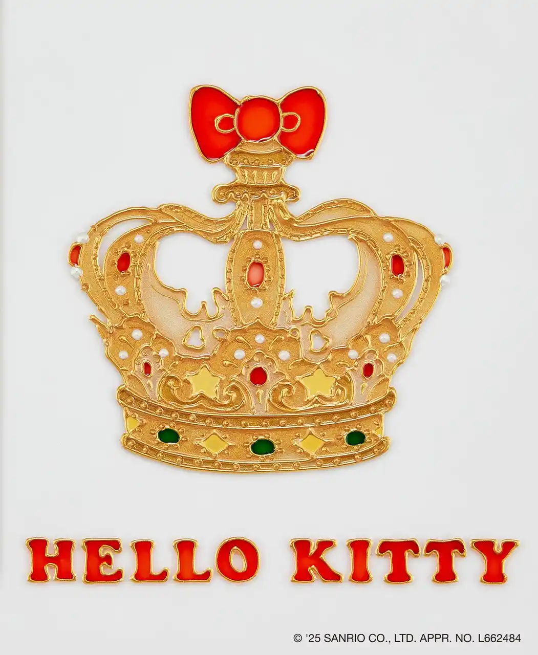 缶の蓋面には、ハローキティの雰囲気を表現した王冠をセンターに配置。エンボス加工の凹凸が細かく、立体的でキラキラして見えます。 |