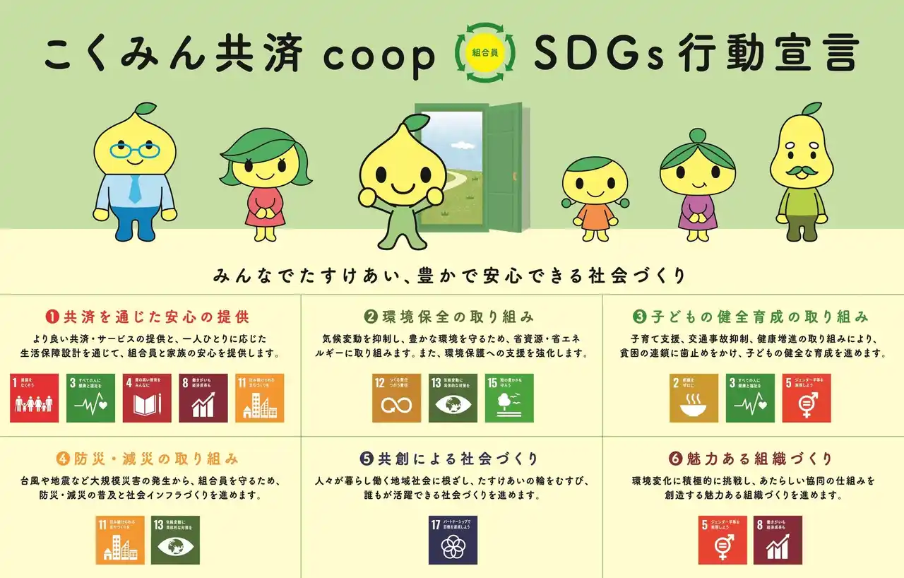 こくみん共済 coop〈全労済〉(全国労働者共済生活協同組合連合会 代表理事理事長:打越 秋一)では、SDGsの達成に貢献していくため、「こくみん共済 coop SDGs行動宣言」にもとづき、「事業(商品・サービス)」と「社会課題の解決(社会活動)」を通じて、持続可能な社会づくりに取り組んでいます。 |