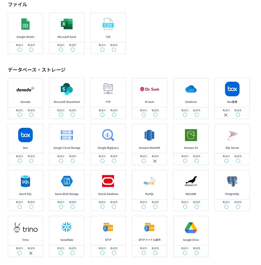 | ・主要なクラウドサービス、データベース、ファイル形式に対応 | ||||||||||||||