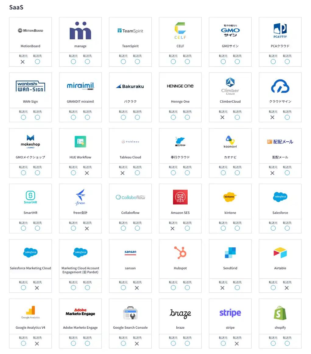 kintone、Salesforce、Google BigQuery、SmartHRなど、100種以上の多種多様な SaaSを連携し、データ運用の効率化とデータ活用の高度化を支援します。