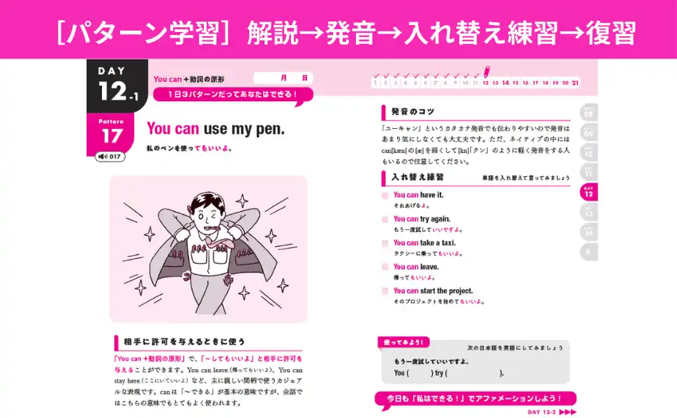 | ◆学習の「習慣化」と英会話の「必須フレーズ」が同時に手に入る | |||