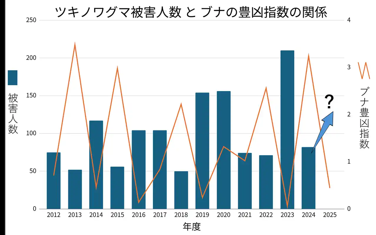 ドングリなどの堅果の豊凶とクマの出没数・被害人数には関係があることが知られています。堅果が凶作の年は、山で餌が不足するため、人里に出没する数が多くなり、それに伴って人身被害の件数も増える傾向があります。東北森林環境局によると、2025年は東北各県でブナが大凶作の見通しで、人里へのクマの大量出没が懸念されています。 |
