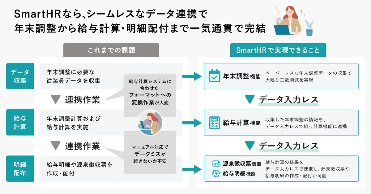 3. シームレスなデータ連携で、年末調整から後続業務までを「SmartHR」上で一気通貫で完結 |
