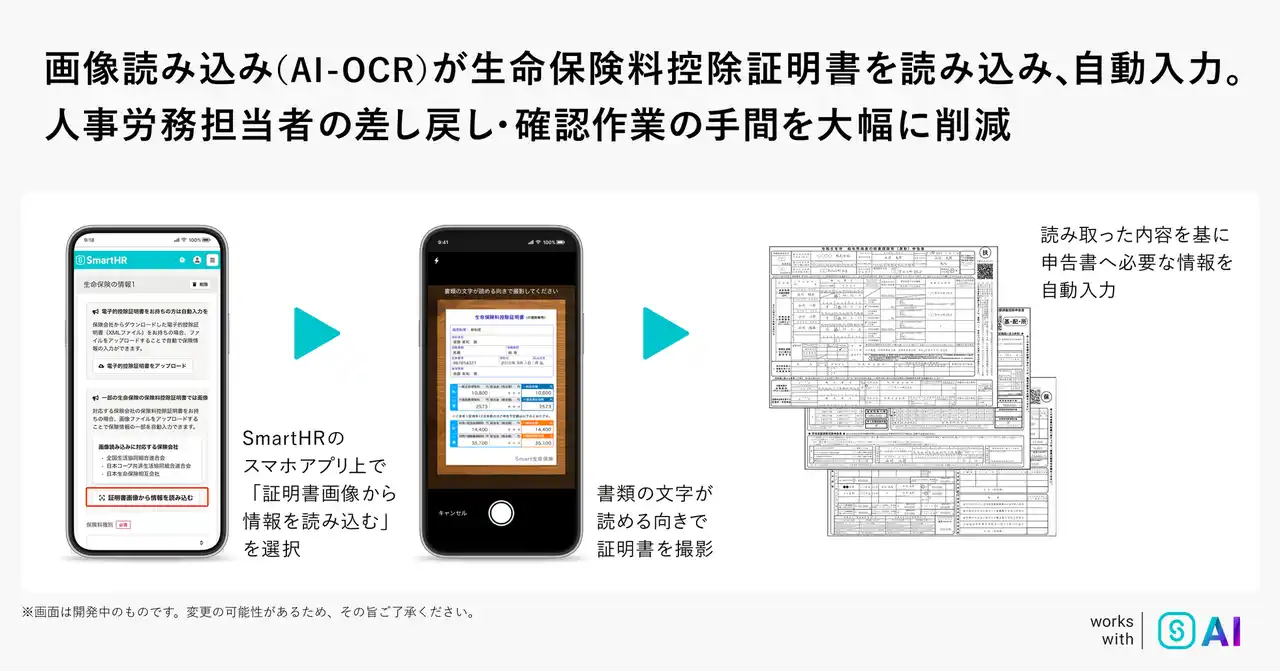 従業員が生命保険料控除証明書を撮影し、スマートフォンアプリにアップロードするだけで、保険会社名や保険料などの情報が自動入力される画像読み込み(AI-OCR)※2を新たに提供します。従業員による手入力を減らすことで、記入漏れやミスを防ぎ、差し戻しの手間を大幅に軽減します。 |