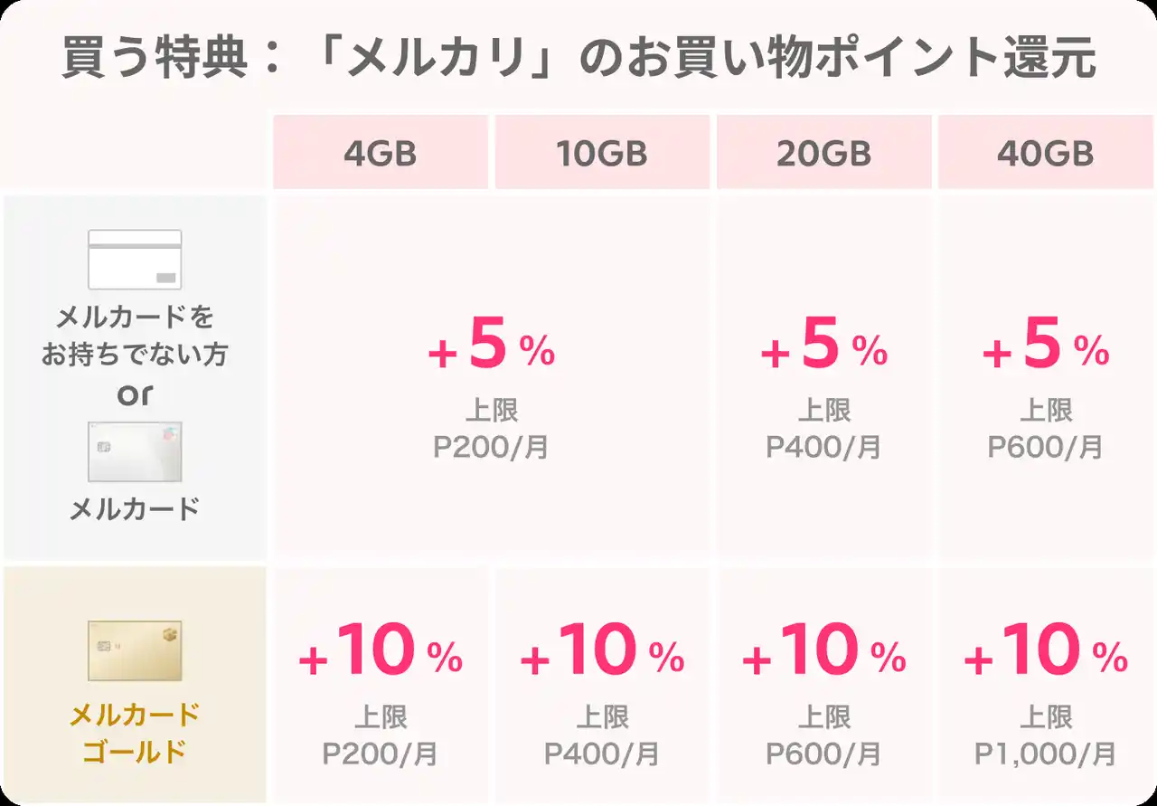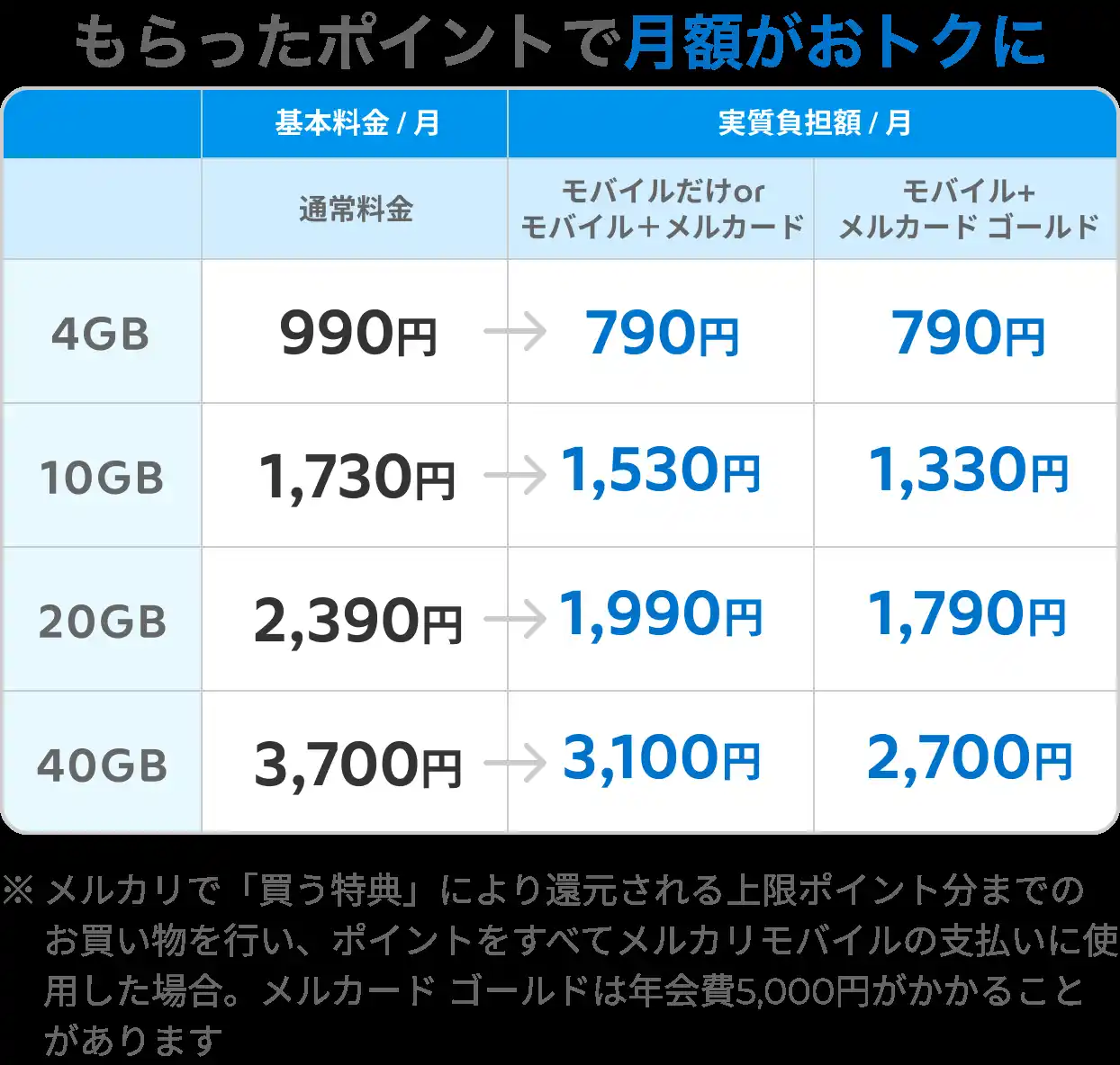 ゴールド」利用のお客さまの「メルカリ」でのお買い物におけるポイント還元率は1%~4%(還元上限あり)であるため、今回の特典分を足した場合の最大還元率は14%となります。「買う特典」でもらったポイントは、メルカリモバイルのお支払いにも使うことができ、たとえば新料金プランの4GBをご利用のお客さまが、「買う特典」で還元された200ポイントをモバイルの支払いに利用した場合、実質負担額は月額790円からとなります。 |