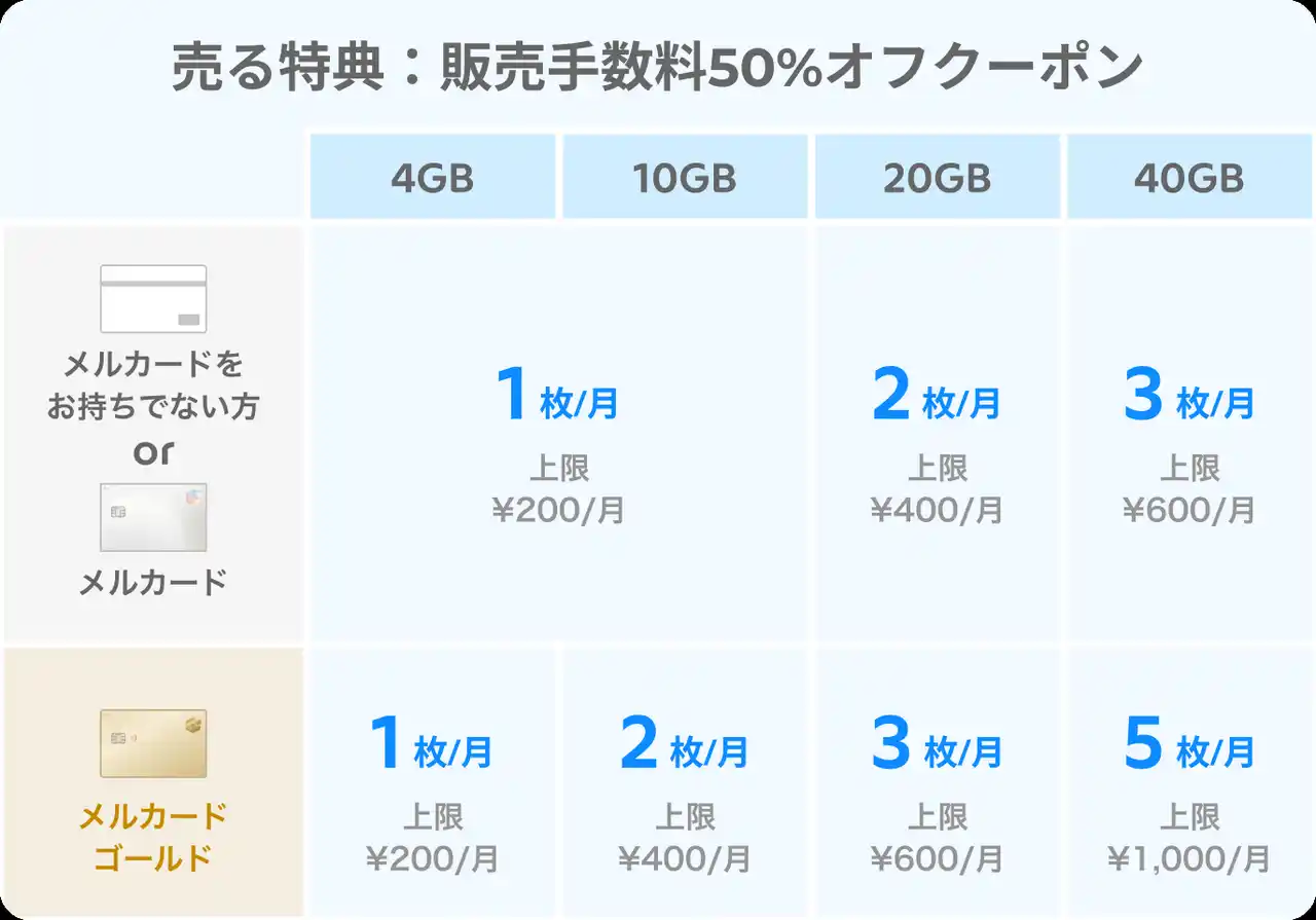 「売る特典」は、「メルカリ」の出品時に使える販売手数料50%オフクーポン(上限200円/枚)が最大5枚もらえる特典です。どちらの特典を選んだ場合も、もらえるポイントやクーポンによる値引きの金額上限は同じとなり、お客さまの「メルカリ」の使い方に合った特典をお選びいただけます。 |