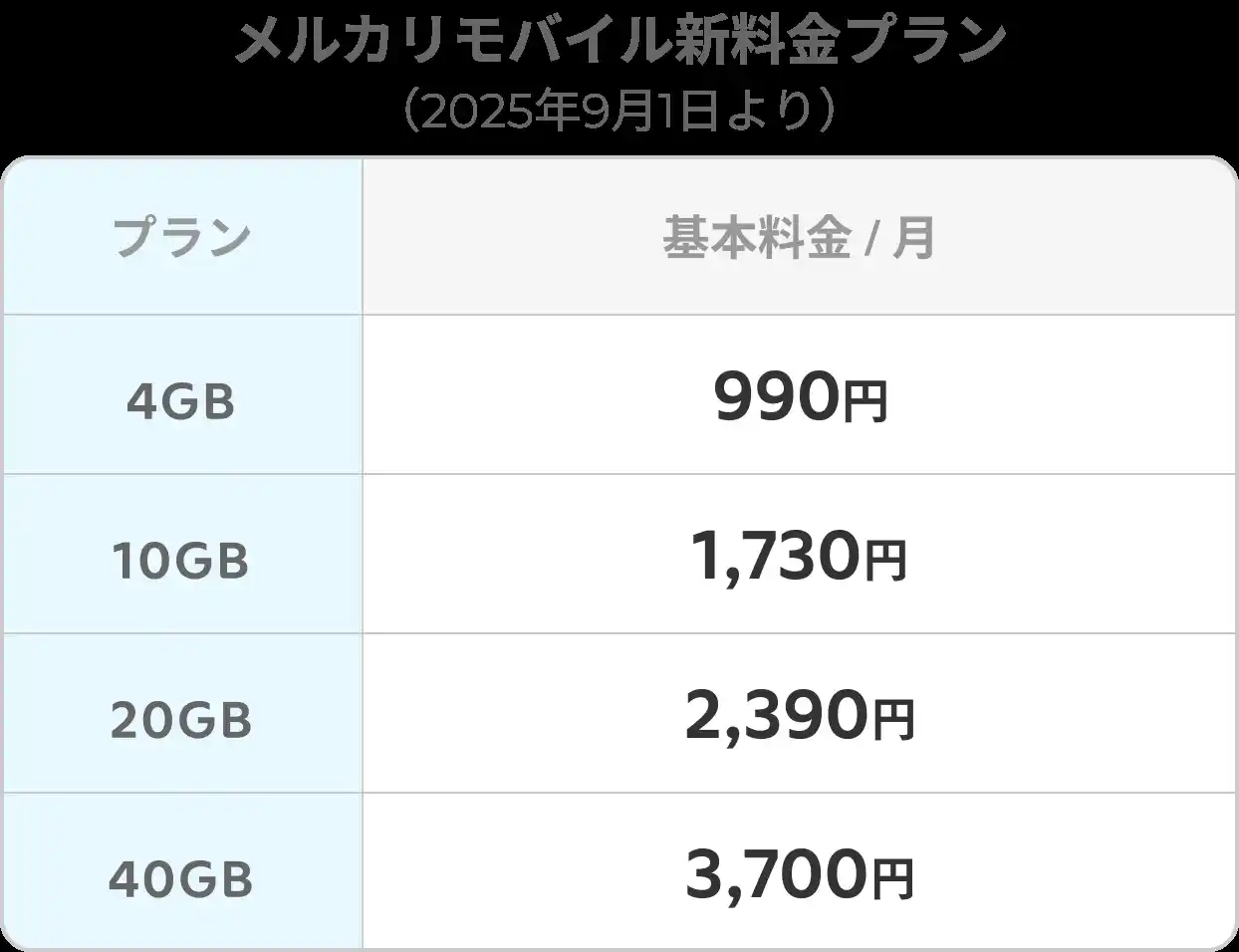 「メルカリモバイル」は2GB(月額990円)/20GB(月額2,390円)の2プランを提供しておりましたが、よりご自身にあったプランをお選びいただけるよう4GB / 10GB / 20GB / 40GBの4プランに刷新いたします。4GBプランは元の2GBプランの価格を据え置きながら容量を倍に増やし、より始めやすい新料金プランにリニューアルしました(※4)。これまで好評だったギガ売買は新料金プランでも引き続きご利用が可能で、拡大した4つの新料金プランとギガ売買により、お客さまにとってより柔軟な選択ができるようになりました。 |