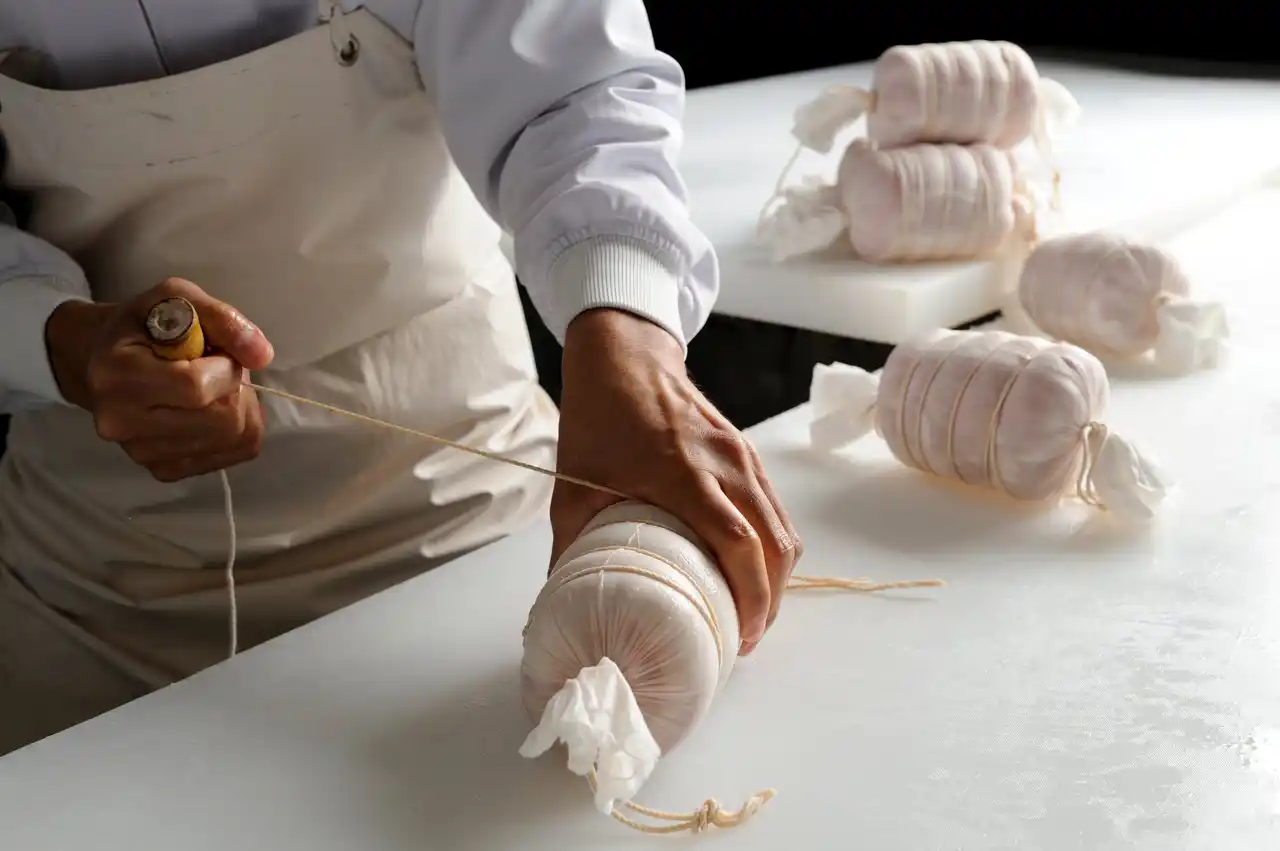 | 鎌倉ハム富岡商会は、明治33年(1900年)創業の老舗ハムメーカーです。英国人ウィリアム・カーティスから伝えられた伝統製法を、創業の地・鎌倉で125年にわたり守り続けています。特に「熟成布巻きロースハム」は、伝統の調味液にじっくり漬け込み熟成させ、職人の手作業で1本1本布と糸を巻き手間暇かけて作られます。しっとりとした食感と豊かな香り、深い味わいが特徴です。食卓に「ごちそう」を届けることを追求しています。 | ||||||||||||||||||