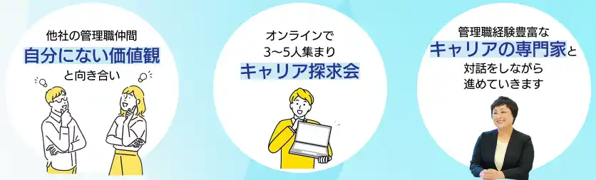 管理職キャリア探求会は、3ヶ月間で、マネージャー・課長・部長など組織マネジメントを行う管理職の立場を通して、“自分にとってのリーダーシップ” や “人と組織と前進する源泉”を問い直し、対話と内省を重ねながら、未来のキャリアに広がる可能性を探っていく、希望の一歩を踏み出す場です。 |