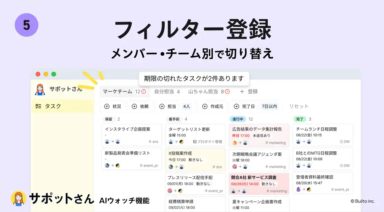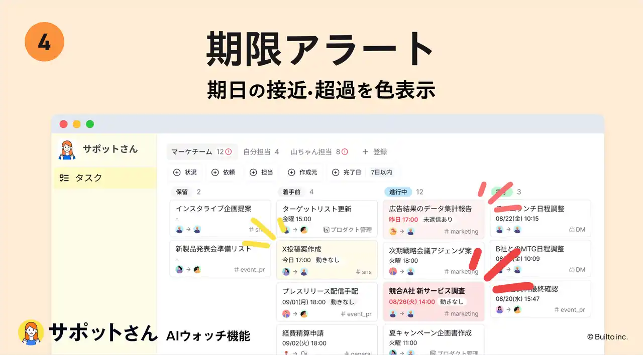 株式会社Builtoは、調整の負担を減らすSlack×AIタスク管理「サポットさん」に、AI進行ウォッチ機能 を追加しました。タスク要約、対応状況ラベル、未返信リスト、期限アラート、フィルター登録を組み合わせ、マネージャーがチームの状況を素早く把握し、進行全体を一目で把握できる仕組みを実現します。 |