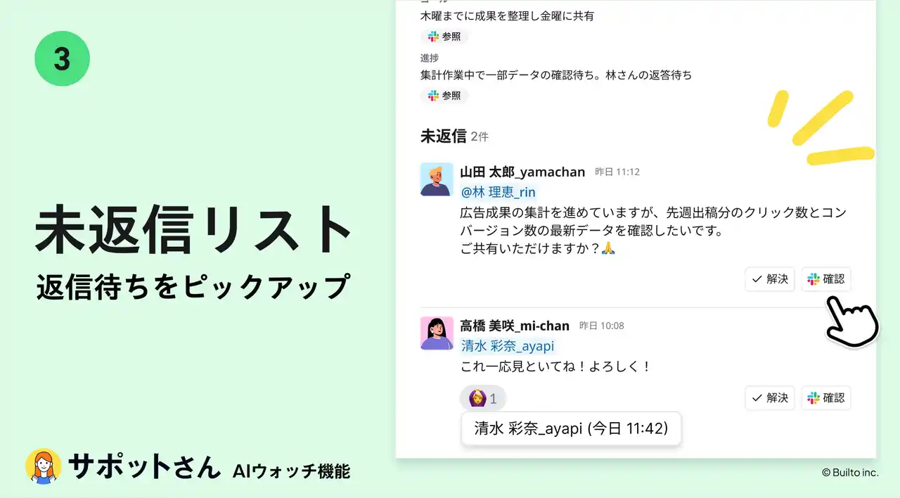 こうした課題に対応するために、サポットさんではAI進行ウォッチ機能を追加しました。 AIがSlack上のやりとりを整理・検知し、タスクを俯瞰しやすくする仕組みです。 チームの状況を素早く把握し、優先判断を迷わず進められることを目指しています。 |