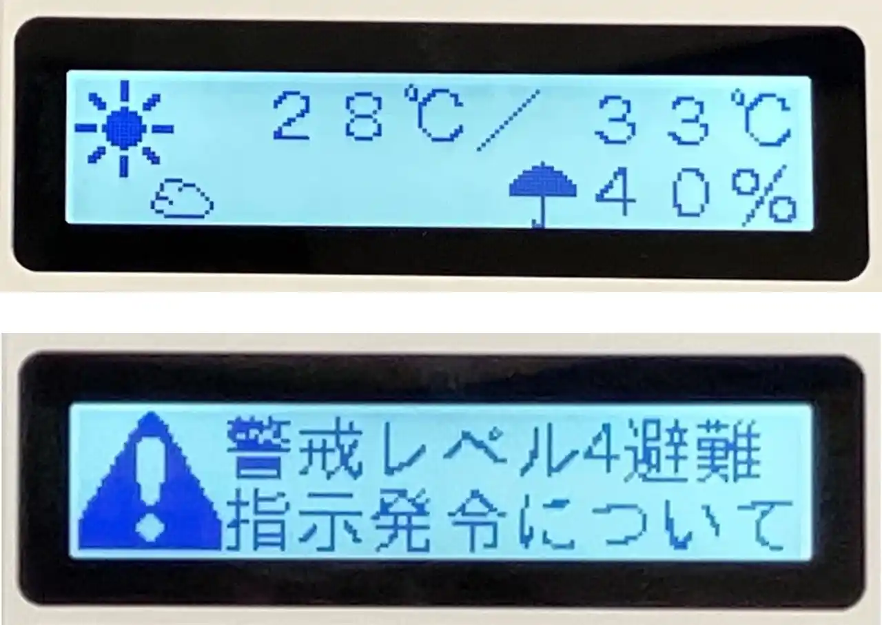 また、ディスプレイには自治体から配信する防災・行政情報だけではなく、時刻や天気予報など、日常的に利用する情報を表示することで、平時からご利用いただけます。 |