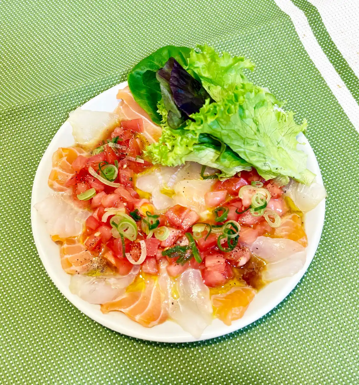 お皿にサーモン、たい、トマト、フリルレタスを盛り付け、混ぜ合わせた調味料Aをかける。 |