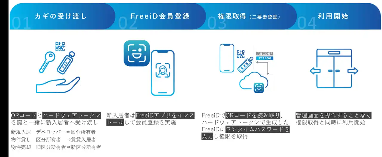 当サービスは、入居者が「FreeiD」アプリを用いて顔認証登録を行う際、ユーザーがハードウェアトークンを所持していることを確認する仕組みを用いることで、真に登録して良いユーザーかを判定することができ、これによって管理会社等を介することなく、顔認証登録の実施、登録ユーザー(入居者)の切替えが可能となります。 |