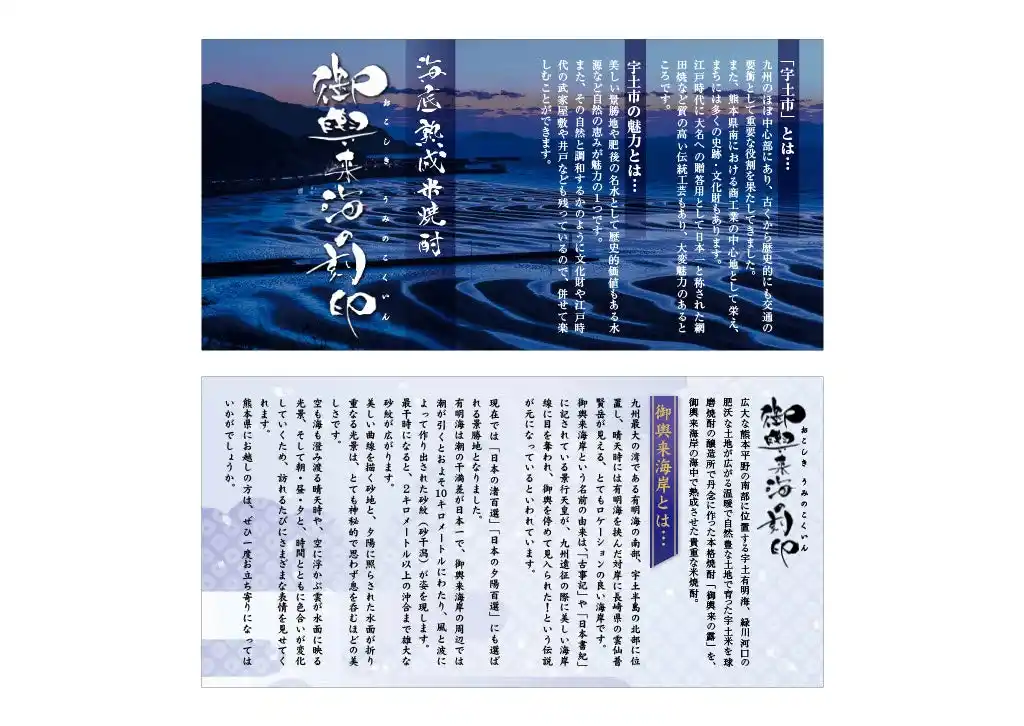 宇土の本格焼酎を宇土半島北部・御輿来海岸近くの海中に沈めて、九か月かけて熟成した焼酎です。海の中では、海中音と波による微振動が二十四時間止むことなく、自然熟成が進むといわれています。厳選された宇土産のお米を原料に、老舗蔵元・深野酒造で丹精こめて作った球磨焼酎が、干満差日本一の有明海の力を借りて、見事にまろやかな味に変化。旨味と深みを増しました。自然環境が装飾した個性的な瓶の風合い。ガラス面にへばり付くフジツボが、長く海の中に沈んでいたことを物語ります。