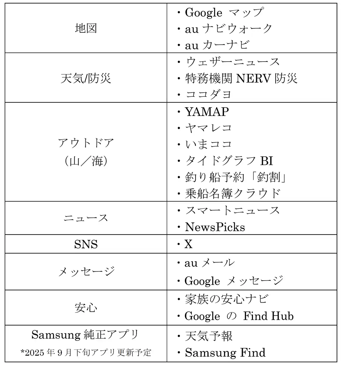 まずは、現在地確認や経路案内ができるGoogle マップ、大雨/台風などの気象情報を確認できるウェザーニュース、防災情報を受信できる特務機関NERV防災、登山情報を確認できるYAMAP、リアルタイムに情報確認/投稿できるXなど、19のアプリから開始されます。 |