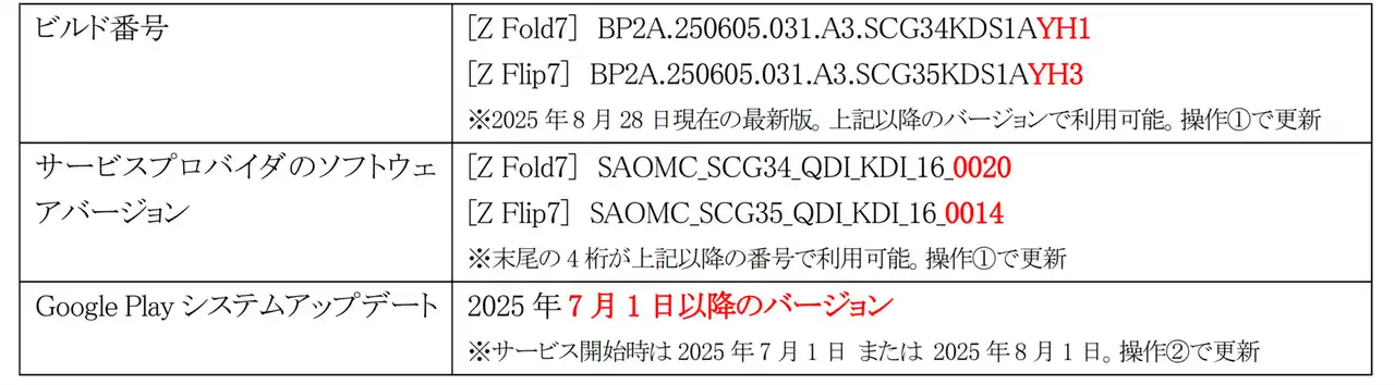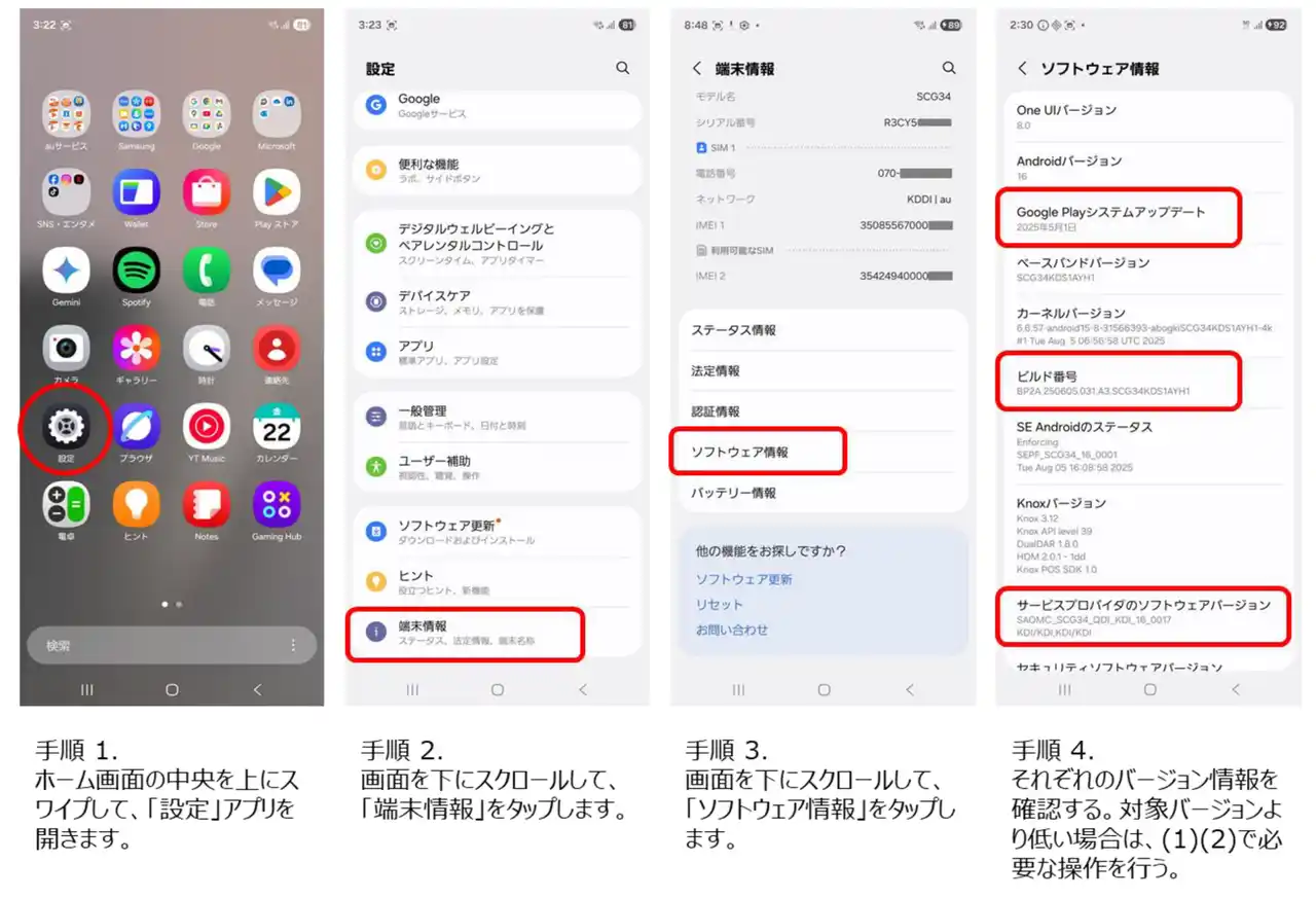 設定>端末情報>ソフトウェア情報により、「ビルド番号」「サービスプロバイダのソフトウェアバージョン」「Google Playシステムアップデート」が対象バージョンに更新されていることをご確認ください。 |